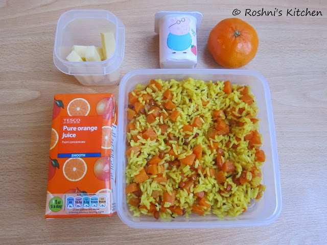 The Lunch - Carrot rice, Orange juice, Yogurt, Orange and Cheddar cheese.