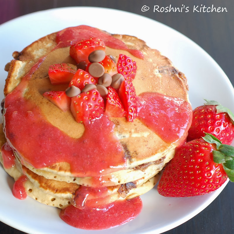Now when you are indulging, why not indulge in a healthy way? Yes going whole wheat is a definite way to add to the health quotient of your pancakes. So here you are - Whole Wheat Chocolate Chip Pancake with Freshly made Strawberry Sauce just in time for Valentines Day (or well just about any day). Treat yourself!