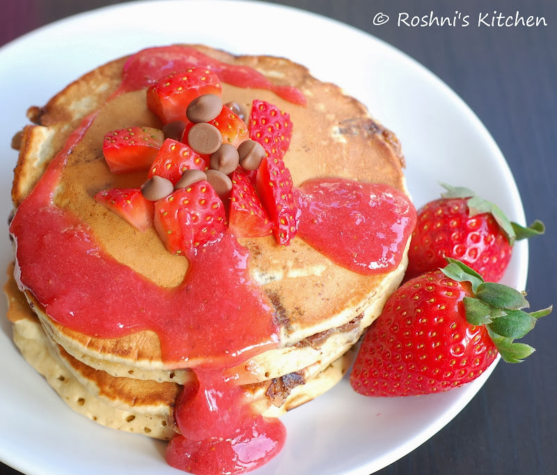 Whole Wheat Chocolate Chip Pancakes with Strawberry Sauce - Valentine Special - Vegan Option